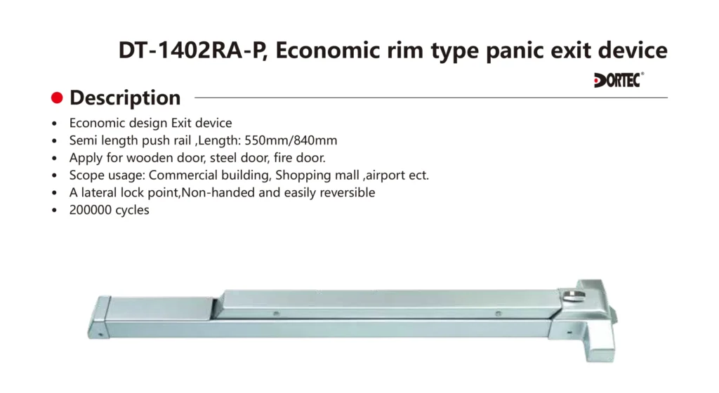 • Rim panic (rim exit device): DORTEC Rim panic exit device mounted at the surface of the door and operates the latch that engages the strike on the frame. Very common on commercial doors.